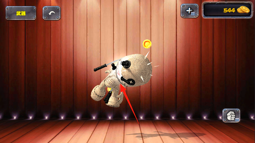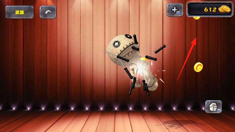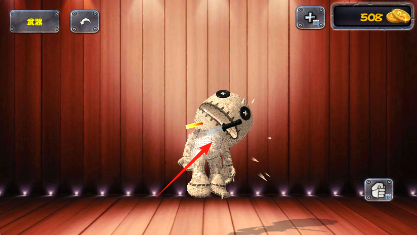 1、进入游戏可以点击武器按钮选武器,对红箭头指向木偶部位攻击,造成伤害。