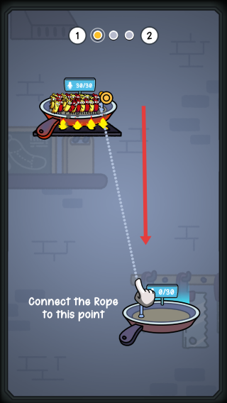 1、开始第一个关卡,按找指头的指引将绳子连接上下煎锅对应的点,搭建小鸡转移通道,确保稳固。