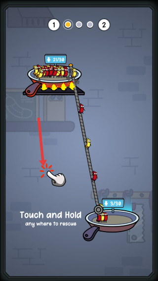 1、画线规划逃生路线:通过手指画线为被困的香肠人拉扯绳子,作为他们从高地逃生的路线,线条的走向需合理,必须能确保引导同伴们安全的下滑。