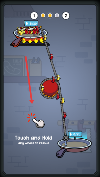 2、通道搭建完成后,依据点击该处的提示,点击屏幕任意位置,控制绳子节奏,护送小鸡到煎锅。