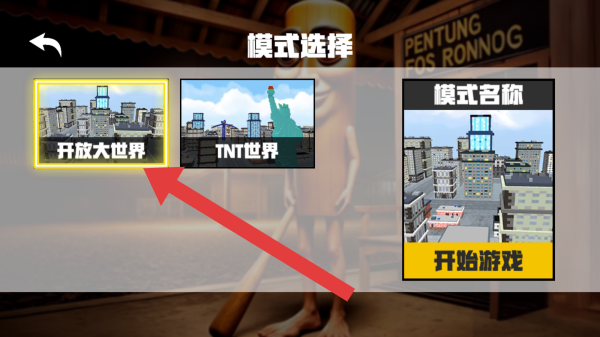 1、画面呈现两种模式的选择,有开发大世界、TNT世界,可选择第一种后再点击开始游戏进入。