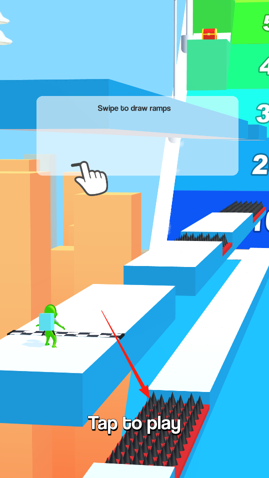 1、进入冷冻骑士,点击Tap to play使绿色角色启动,滑动屏幕绘制斜坡,搭建通行路径。