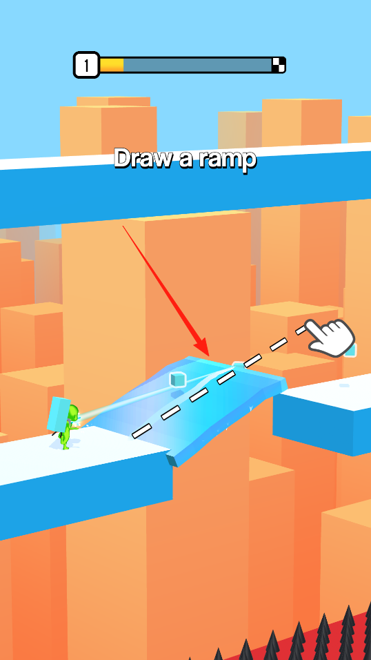 2、按照Draw a ramp提升在虚线上绘制斜坡,借助斜坡跨越尖刺陷阱,继续向前探索关卡。