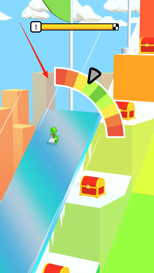 3、出现温度弧形刻度条,将指针移动到绿色区域,让角色能顺利通过关卡,到了终点还有宝箱能开启。