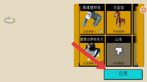 2、这是Minecraft的模组选择界面,展示黑猩猩邦佐、马宝宝等可安装生物模组,可点击应用进入场景。
