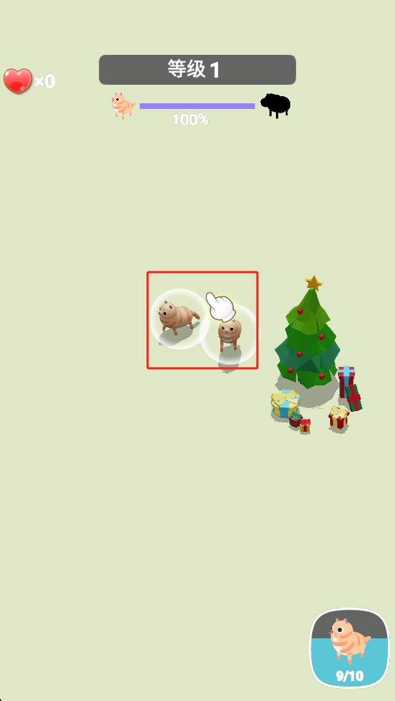 2、场景出现两只猫咪后,跟随手指提示合并它们,使等级进度条满至100%,完成当前阶段任务。
