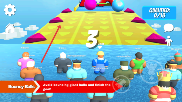 1、在开局倒计时结束后,用户快速起跑,沿黄色路径前进,注意躲避滚动的巨型球,保持节奏别被淘汰。