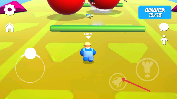 3、跑到在绿色横杆等障碍处,需要精准点击跳跃键通过,留意上方滚动的球,保持移动,争取成为晋级的18人之一。