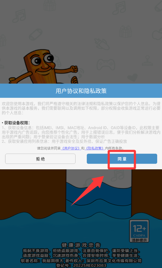 1、点击用户协议和隐私政策里的同意并进入。