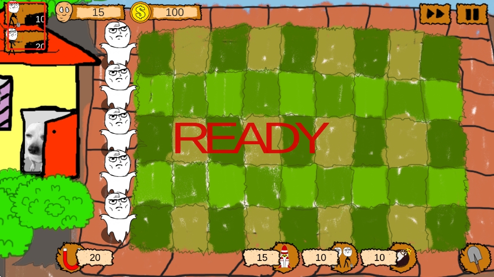 1、开局READY阶段,消耗金币从左侧选择兵种,拖放至草坪方格布置防线,准备抵御幽灵敌人进攻。