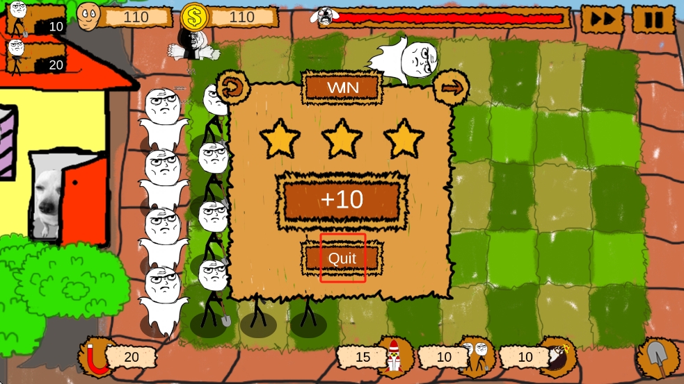 3、成功击退所有敌人后,界面呈现三星胜利与+10分数的奖励,点击红色框内的Quit按钮,结束本关并筹备下一挑战。