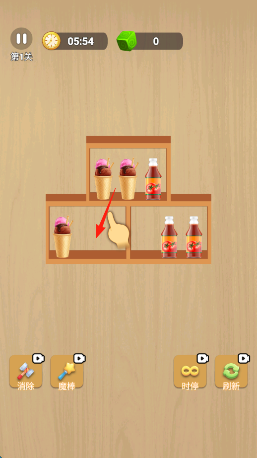 1、关卡1,按提示移动物品,将同类型物品甜筒放一起、番茄酱瓶放一起归位,完成初步整理。