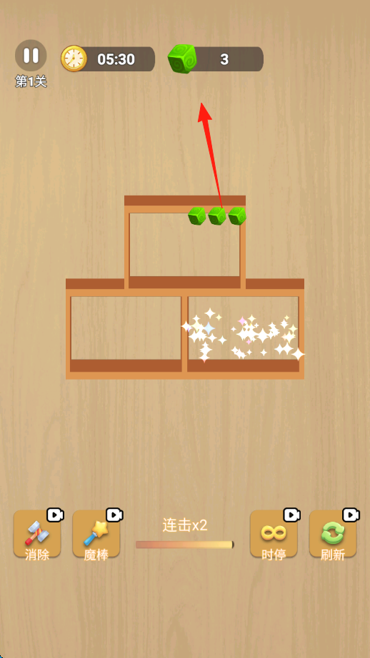 3、当物品整理完毕,绿色方块魔块掉落,点击收集,完成关卡1挑战,获取奖励,解锁新关卡。
