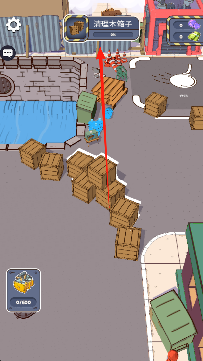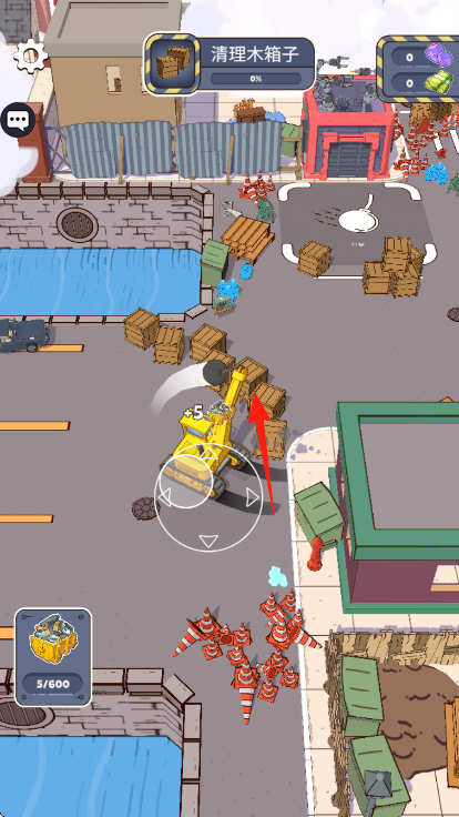 2、操作挖掘机,对准木箱,按提示清理,积累进度如从0/600到5/600,完成清理木箱子任务。