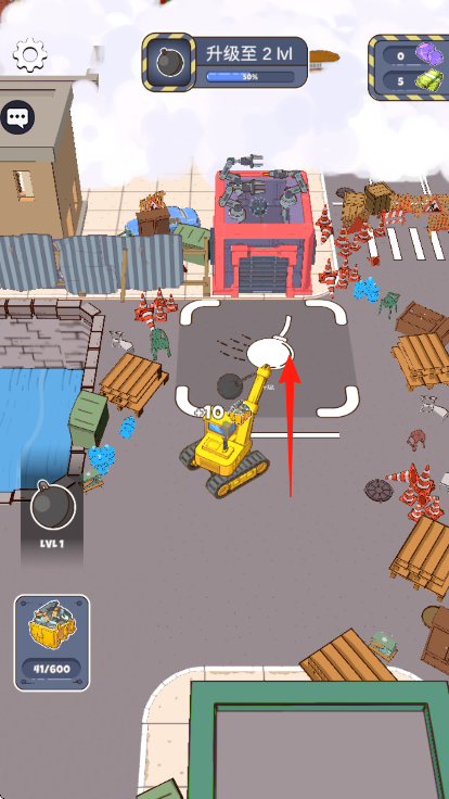 3、任务推进后,解锁新目标如升级至2M,操控挖掘机沿红箭头,前往新区域,继续清理、升级。