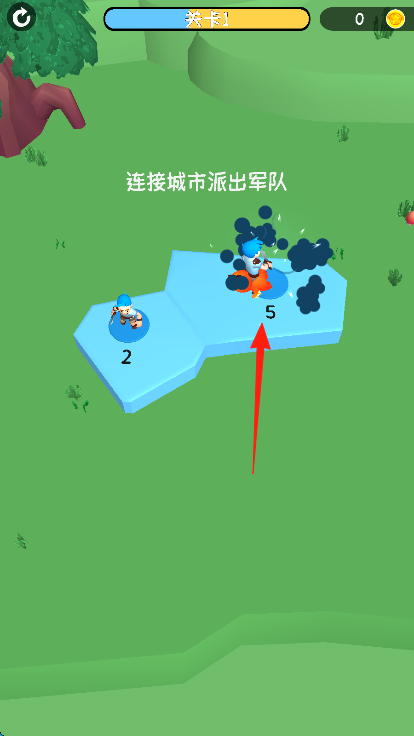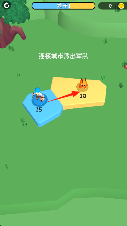 1、关卡1,按连接城市派出军队规则,点击蓝色区域(数值15,派出对应数量军队,沿红箭头进攻橙色区域。