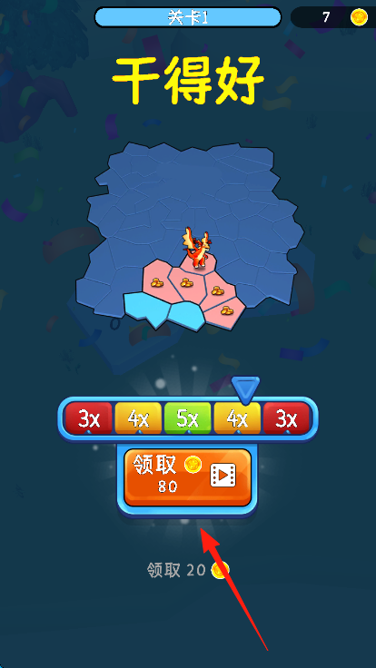 3、成功占领所有区域后,出现干得好结算界面,点击红箭头指向领取80按钮,获取金币奖励,用于升级或扩张。