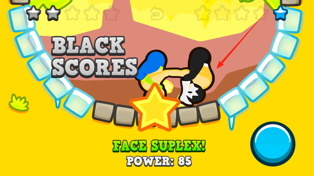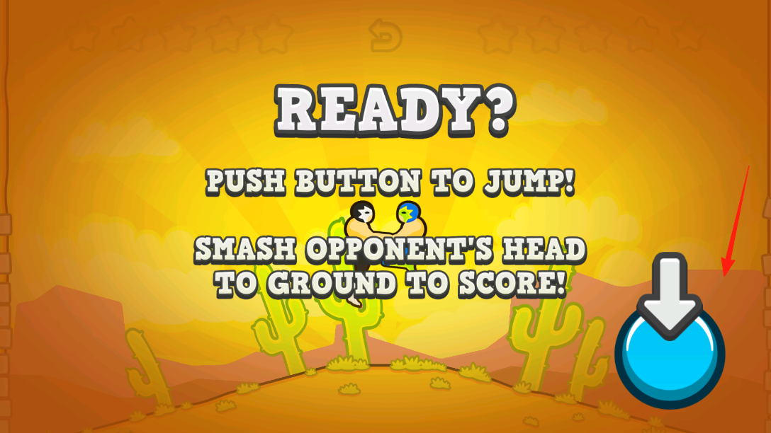 1、按下右侧蓝色按钮,触发角色跳跃,在对战中借跳跃时机将对手头部砸向地面,以此完成得分,开启摔跤对决的核心循环。