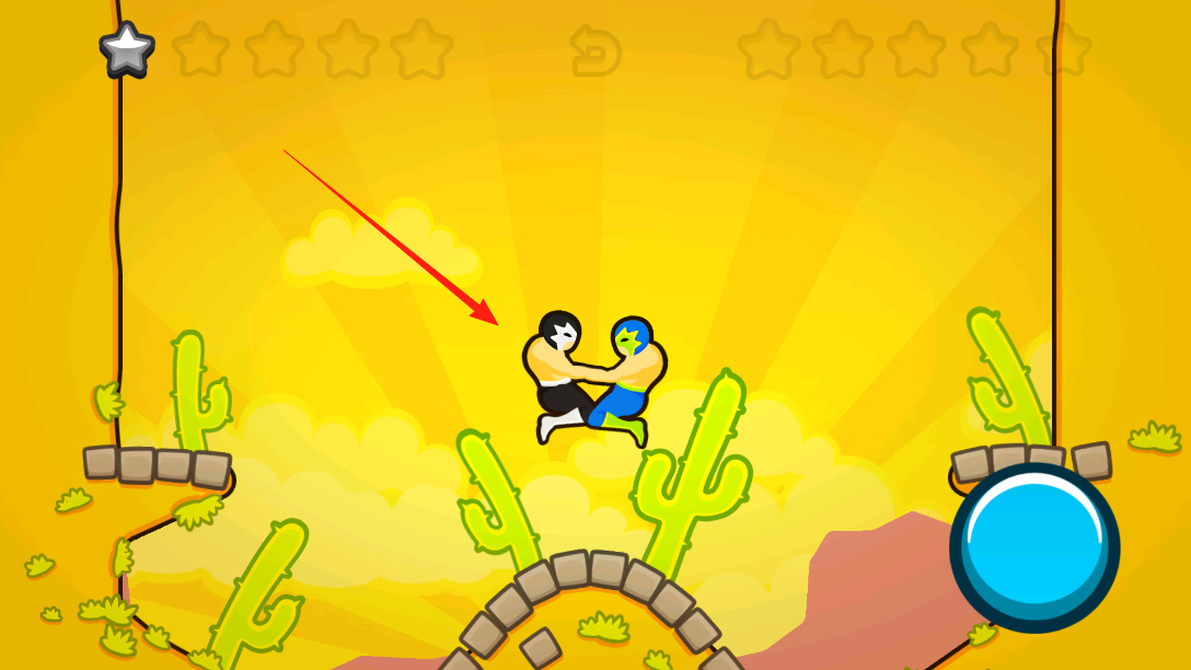2、操控角色与对手扭打,在仙人掌地形间移动,借助跳跃跨越障碍维持格斗姿态,通过调整动作方向,争夺对战优势推进格斗进程。