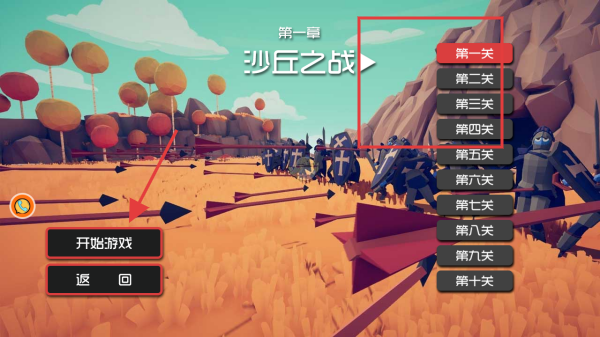 1、在游戏的关卡选择界面,有多个关卡可供选择,点击开始游戏按钮,即可进入游戏,开启你的战斗冒险之旅。