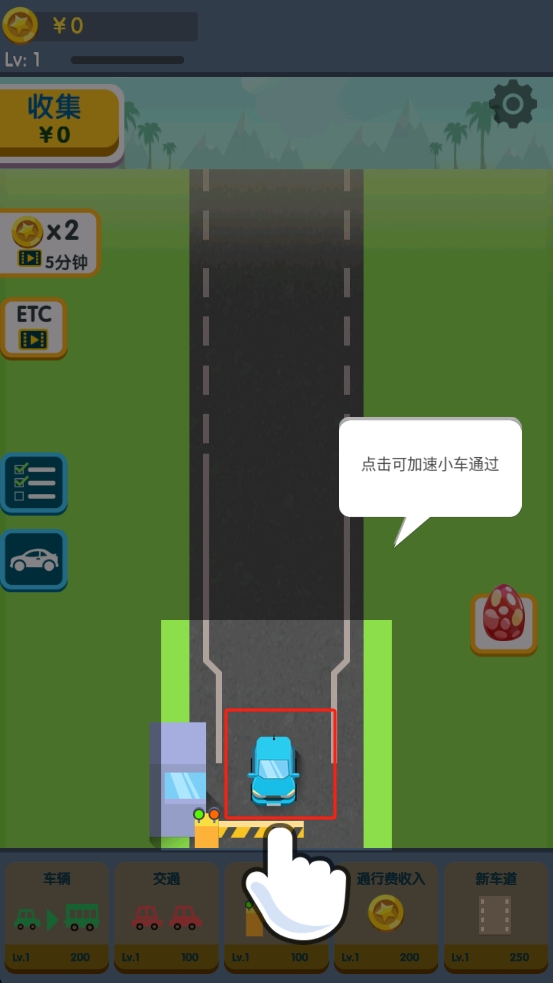 1、开局我们点击屏幕下方的蓝色小车,使其加速通过收费站,获取初始通行费,开启车辆运营。
