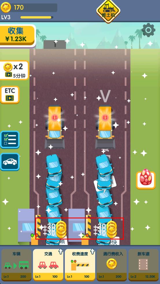 2、双车道车辆排队,点击红色框选的金币标识对应车道,收取通行费,留意上方推土机障碍,合理调度车辆加速通过。