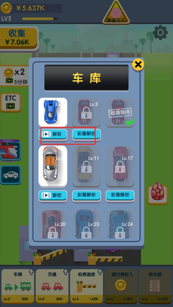 3、进入车库,这里可通过广告或者彩蛋来获取蓝色跑车等高级车辆,提升等级增加通行费。