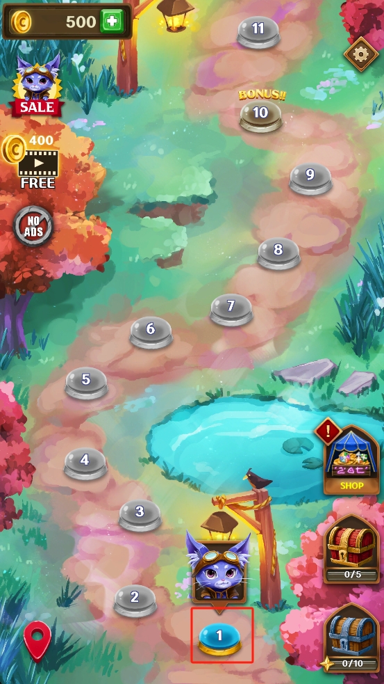 1、点击地图底部标有蓝色1的按钮,进入第一关的宝石消除关卡,准备通过交换同色宝石,完成收集任务。