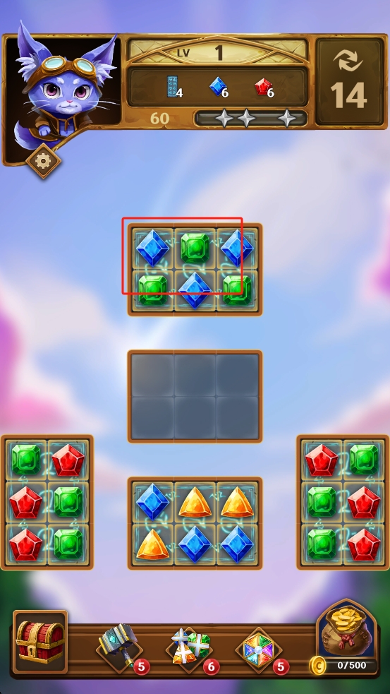 2、观察上方红色框内的宝石布局,交换相邻同色宝石触发消除,积累分数并达成目标数量。