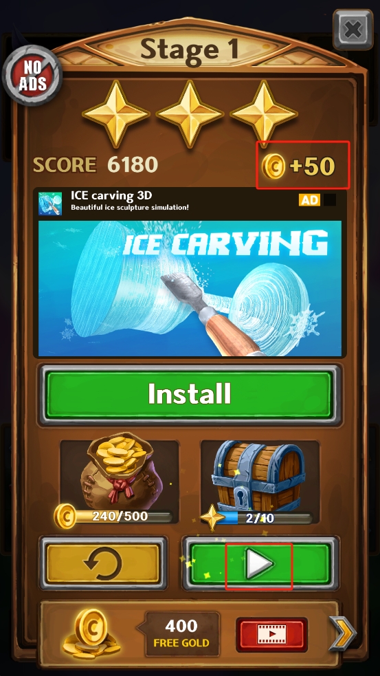 3、通关当前关卡后,界面会弹出消除统计面板,点击绿色箭头按钮进入下一关,也可通过广告、宝箱获取更多金币与道具。