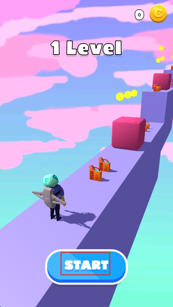 1、点击蓝色START按钮开启关卡,操控背喷气背包的角色沿紫色路径前行,优先收集金币与橙色油桶,为喷气装置补充能量。
