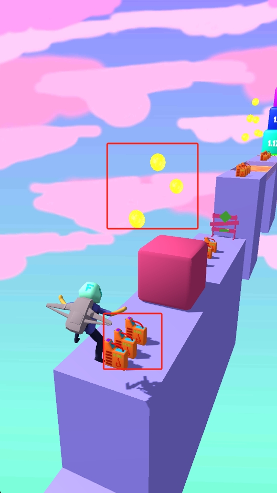 2、奔跑时拾取红色框选的橙色油桶,维持喷气续航;跃过粉色方块前,瞄准上方红色框选的金币区域,调整起跳时机收集空中金币。