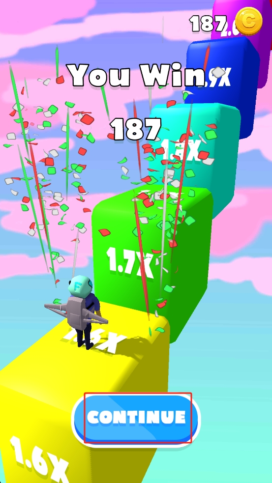 3、关卡通关后,界面会显示本局的分数,点击蓝色的CONTINUE按钮,进入下一关,挑战更高倍数积分的跑酷场景。