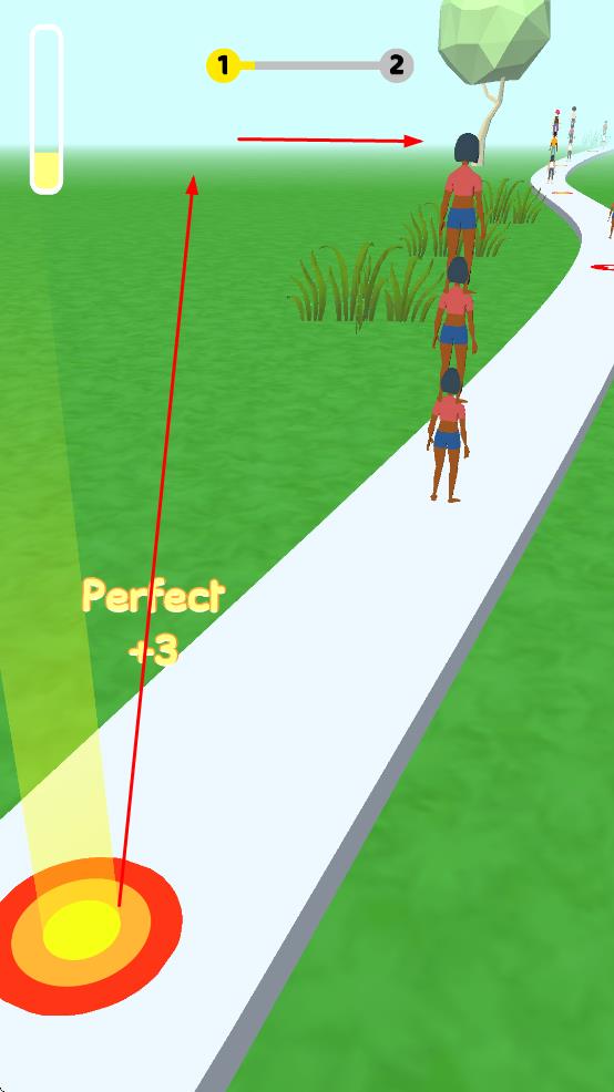 1、操控角色在绿色草地的白色路径上移动,点击路径上的红黄靶心区域触发跳跃,收集沿途相同装扮的角色,形成队列。