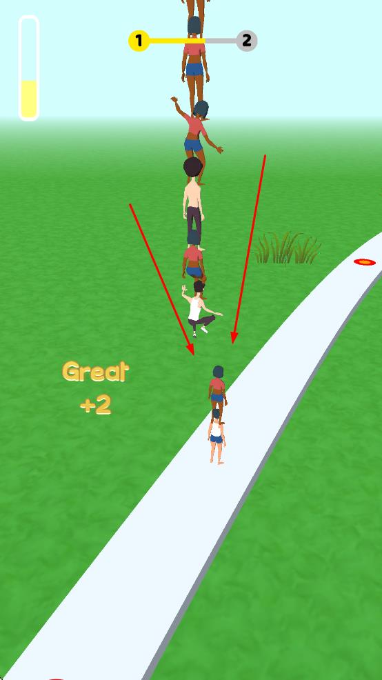 3、推进至关卡终点的彩色阶梯区域,阶梯上标注数字,队列人数越多可抵达更高层级阶梯,完成关卡挑战,推进游戏进程。