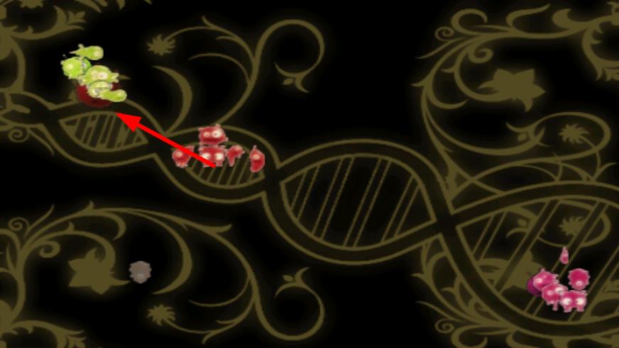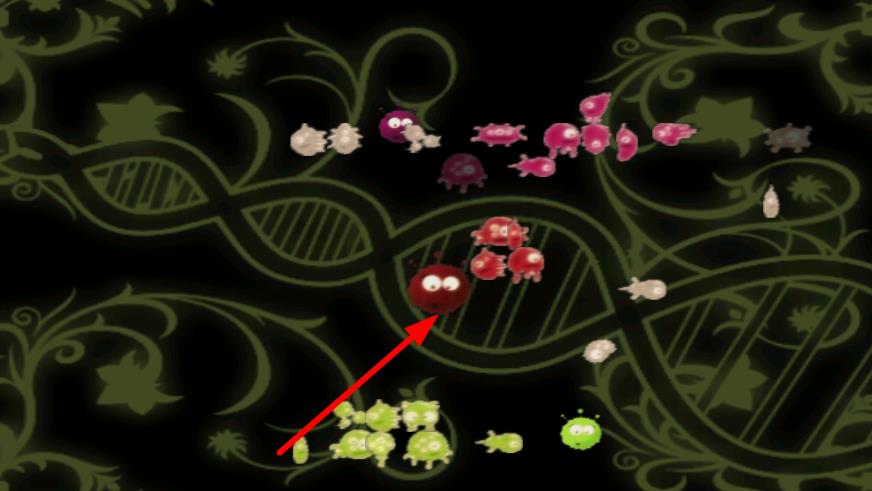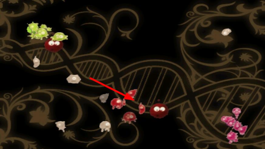 1、选择初始菌落,通过触屏操作让分散的同类细菌聚集,尝试靠近白色细菌获取食物,熟悉聚集与移动的基础逻辑。