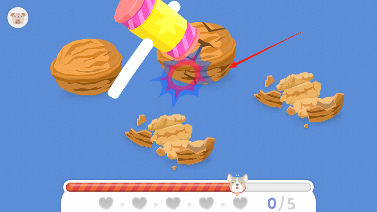 2、操控锤子砸核桃,破碎核桃推进关卡,进度条随敲击更新,完成对应破碎量。