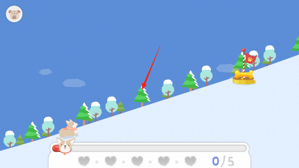 3、引导小狗沿雪坡前行,避障碍集道具,朝坡顶骨头标志移动,完成爬坡推进游戏。