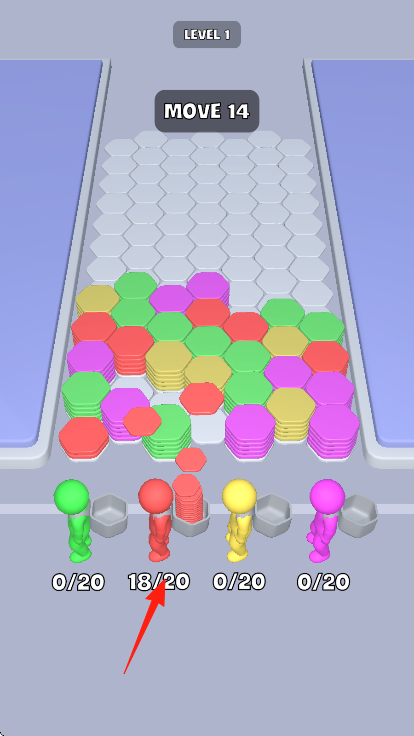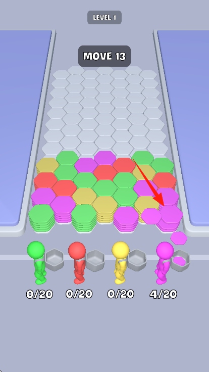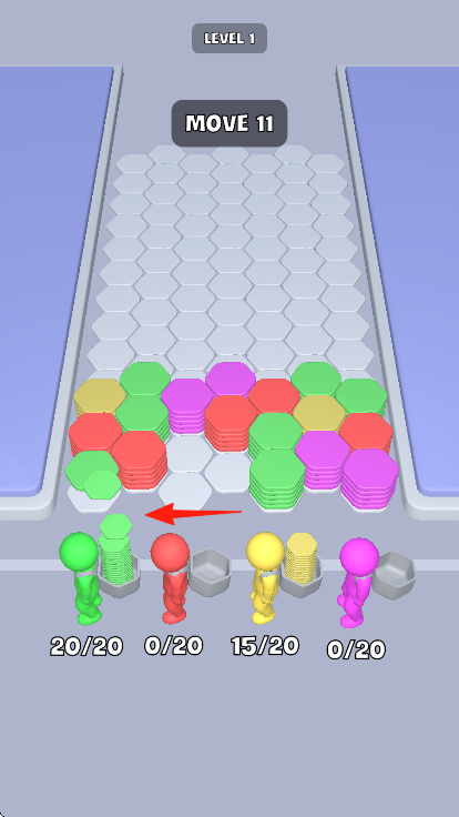 3、拖动绿色、黄色六边形到对应小人容器,填满20个,完成所有颜色收集,通过关卡1,进入下一关。