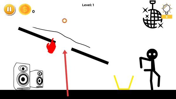 3、在Level-1关卡中,按照屏幕中的手势提示操作,滑动屏幕画出黑色横杆,协助火柴人推进关卡任务。