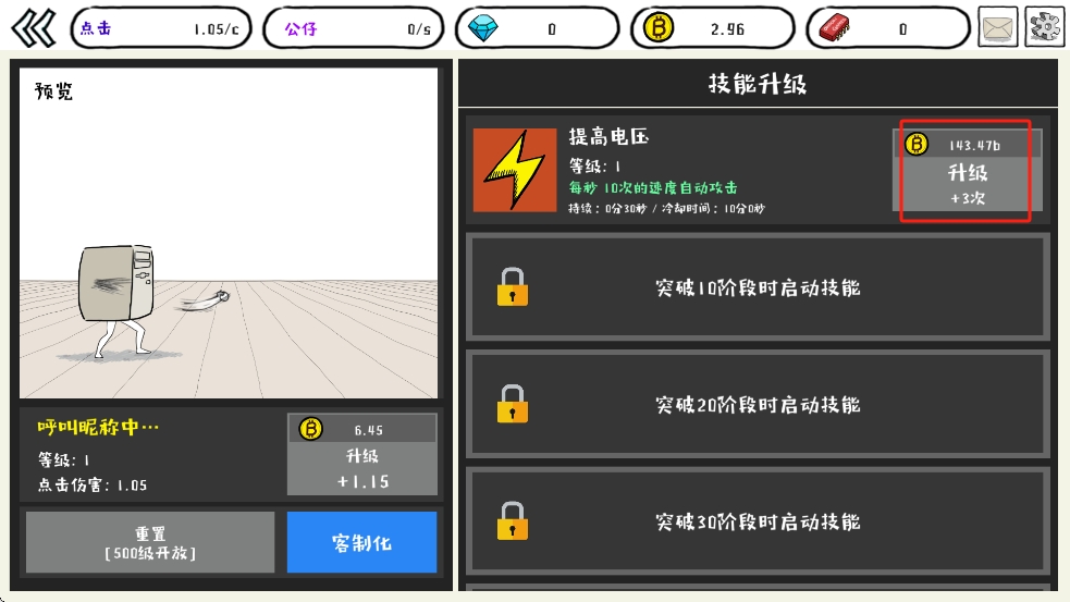 3、进入技能界面,消耗金币点击提高电压旁的升级按钮,提升每秒攻击次数,强化输出备战后续。