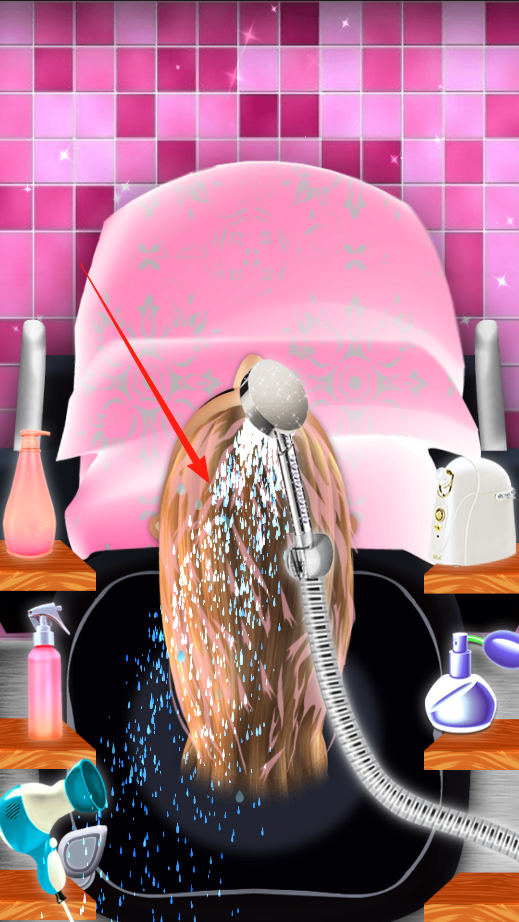 1、点击粉色洗发水瓶,将洗发水涂抹在头发上,使头发覆盖清洁泡沫,通过道具交互,开启头发清洁的第一步流程,体验洗护步骤的启动机制。