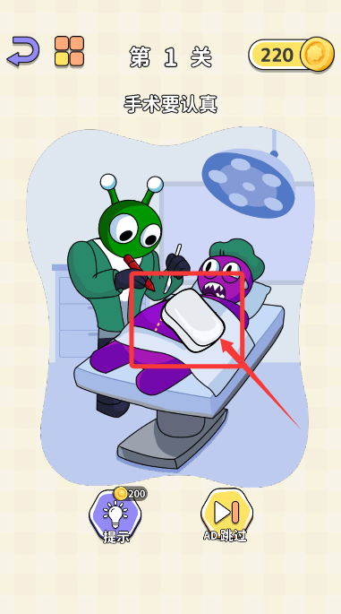 3、进入关卡后依据系统提示,如第一关点指定位置完成操作通关。