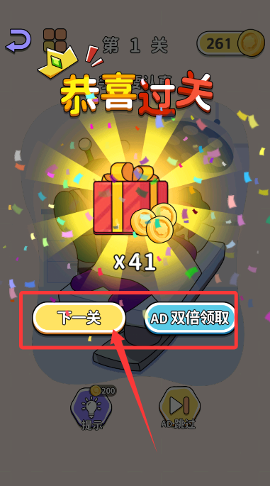 4、挑战成功后,点击“下一关”继续游戏,或选择双倍选项获取更多奖励。