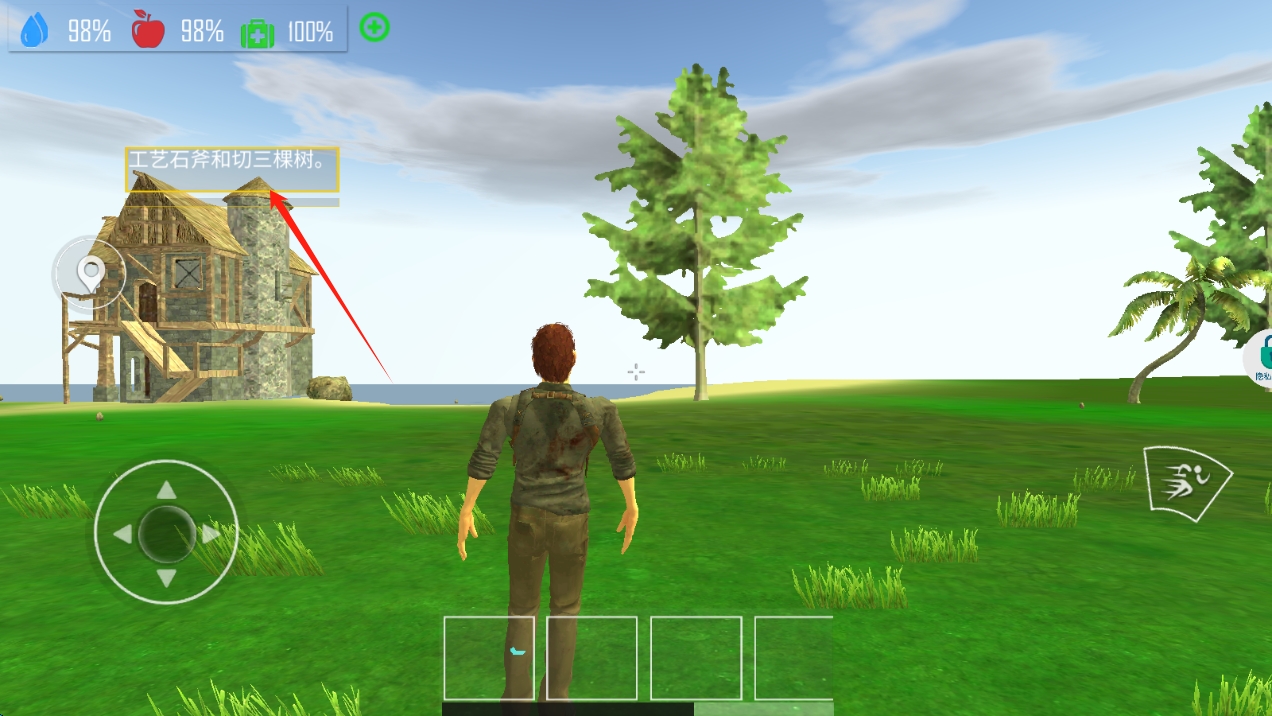 2、游戏中,熟练使用左侧虚拟摇杆,控制角色在荒岛环境中移动,探索资源和安全区域。