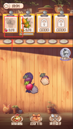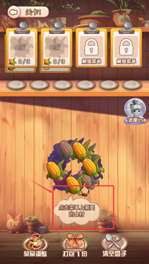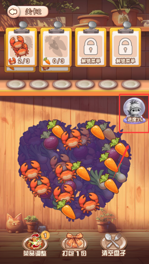 2、融入经典消除机制,通过点选菜单栏中的同类食材完成匹配消除。