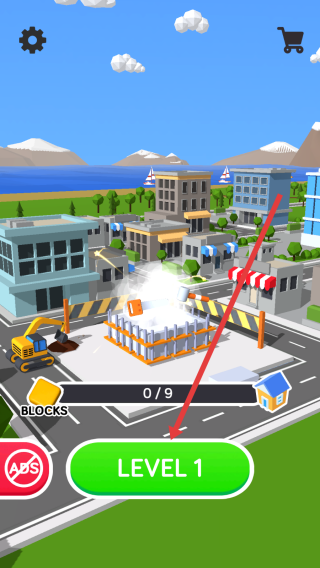 1、在建筑消除游戏主界面,根据指示通过点击绿色LEVEL-1按钮,进入第一关的消除挑战流程。