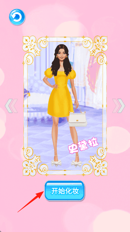 1、在角色选择界面,点击开始化妆,进入史黛拉化妆流程,粉色背景、金色相框展示角色,准备为其美妆、换装。