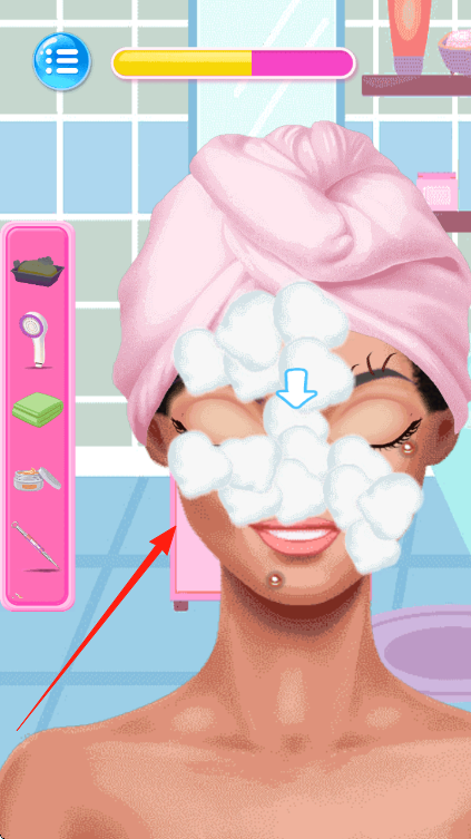 2、进入面部护理,按红箭头提示,使用左侧工具如洁面刷、毛巾,先清洁泡沫步骤,再依次护理,完成基础面部流程。