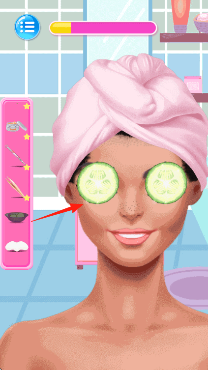 3、继续面部护理,红箭头指向黄瓜片步骤,从左侧栏选对应工具,为角色敷黄瓜片,完成后解锁新美妆工具,持续为史黛拉化妆。